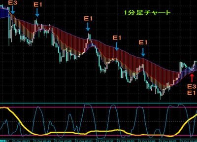 5分足のオリジナル指標でトレンドを確認してから1分足の決められたエントリーポイントで仕掛けていきます。