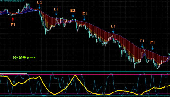 5分足でチャートでトレンドを確認してから1分足のチャートでエントリー判断を行っていきます。